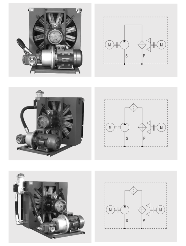 应用适用于:液压系统独立冷却回路、润滑系统及齿轮减速箱的冷却。 典型应用:各种液压动力站、润滑系统、齿轮变速箱的冷却。 产品特性 35bar静态额定压力,冷却器部分采用标准电机和高强度风叶,加以紧凑高效的散热片,以获取佳冷却效果。 油泵电机和风扇电机分别控制,油温较低时可关闭风扇电机,以达到节能,低维护成本的效果。 油泵与散热器连接后可形成安全、独立的循环冷却回路,避免了系统回油的冲击,也可加设高性能的过滤器。 采用自吸能力强、低噪音的齿轮泵,泵进油口的高压力可达-0.4bar。 泵的排量:32ml/rev、40ml/rev、63ml/rev、80ml/rev。其他排量请与锦润联系 8种配管方式可选,能满足任何需求,请参考配管示意图。 进、出油口标准为:G螺纹或SAE标准法兰,其他牙口也可定制。 工作电压: AC380V、AC440V、AC690V。 特殊电压请与锦润联系。